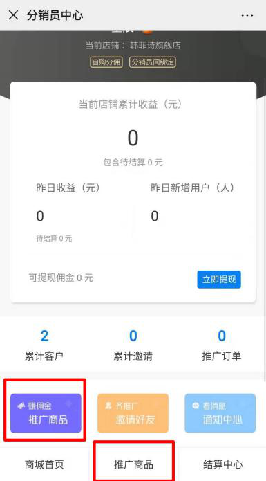 分銷員在【分銷員中心】,點(diǎn)擊“賺傭金·推廣商品”,可以查閱所有正在參與分銷的商品,