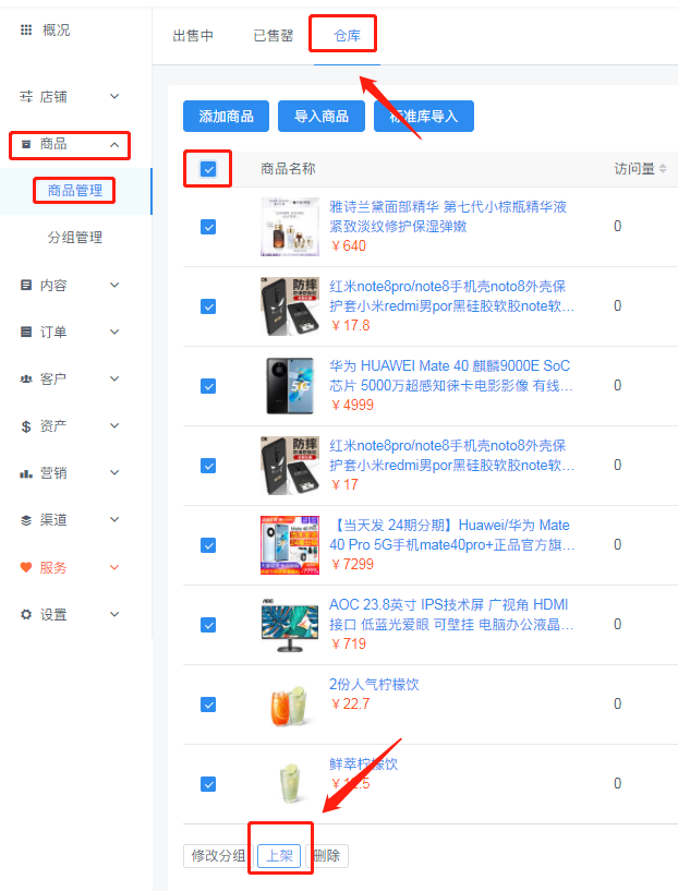需要商家去“商品----商品管理----倉庫”選擇商品進(jìn)行上架。