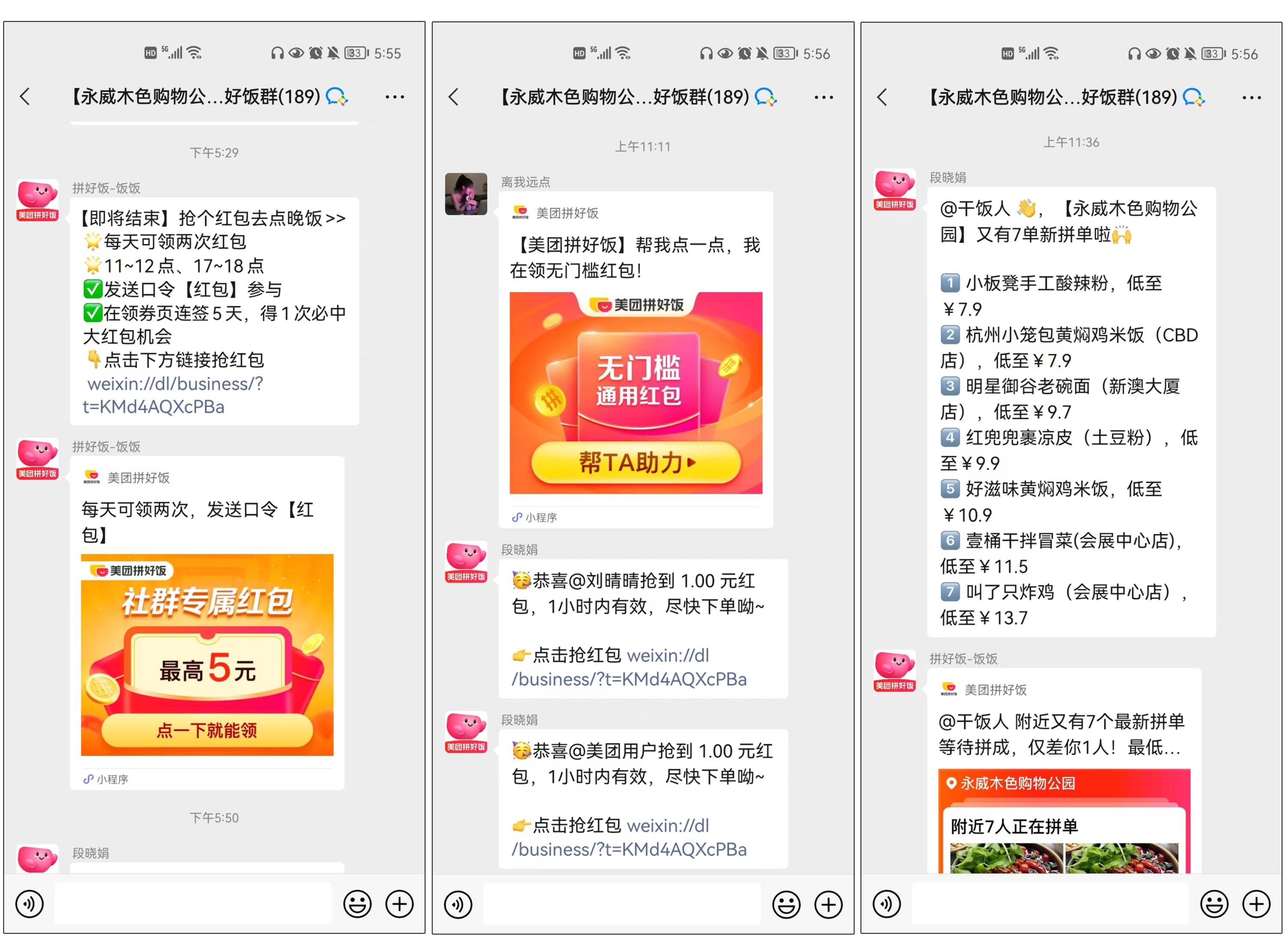 比如看到的一個案例:最近美團推出的拼好飯,根據(jù)位置匹配,加入附近拼飯群,福利官每天會在群里發(fā)兩次社群專屬紅包,分別是11-12點,17--18點,在領券頁連簽五天到,還得1次必中大紅包機會;每天11-12點,還會推出拼單連接,增大曝光支持一鍵拼飯。